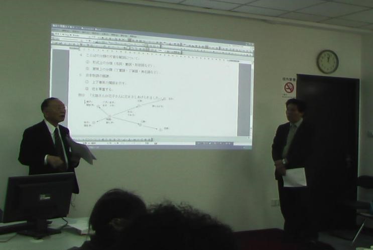 左は谷光先生の講演風景 右は元大連外国語大学日本語学院院長・日本武蔵野学院大学教授劉金釗